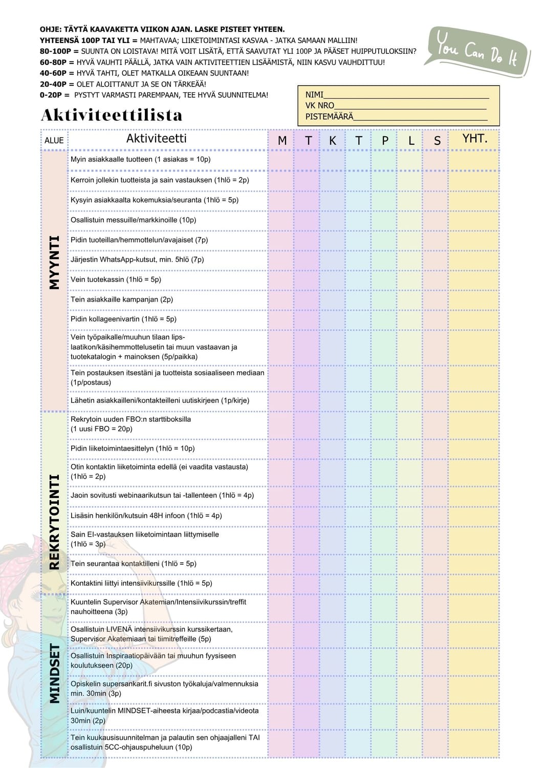 Lataa aktiviteettitaulukko alta ja tulosta tai tallenna se itsellesi. Merkitse siihen aktiviteetteja, joita olet tehnyt viikon aikana. Kun pisteesi ylittää viikossa 100p, niin pääset mukaan 100KLUBIIN!