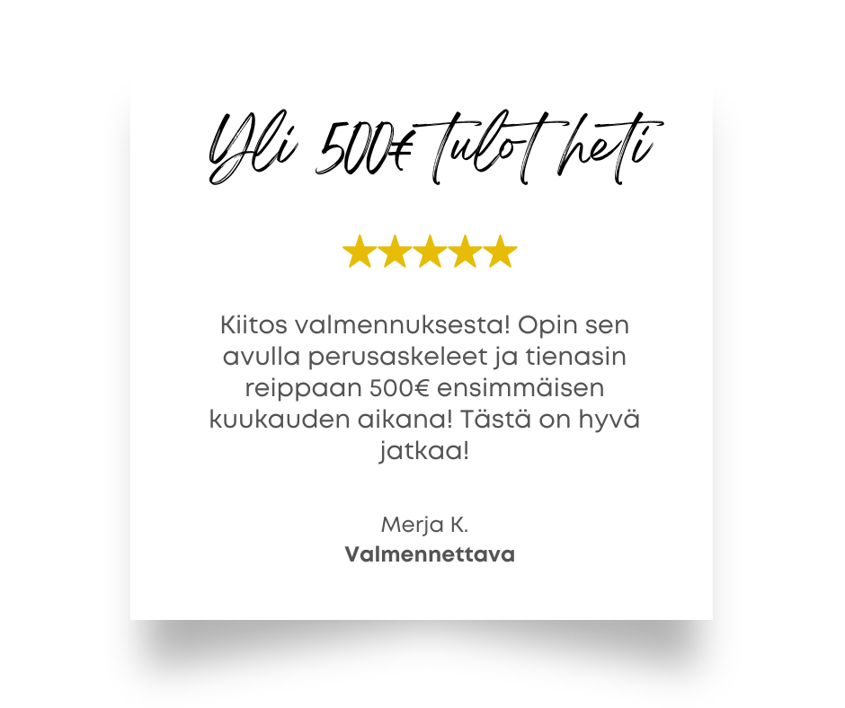 Ymmärrät, miten pienilläkin päivittäisillä teoilla voit alkaa kasvattaa omaa lisätuloasi – ja rakennat pohjan, josta voi kasvaa vakaa ja palkitseva sivutulo (tai vaikka uusi ura).