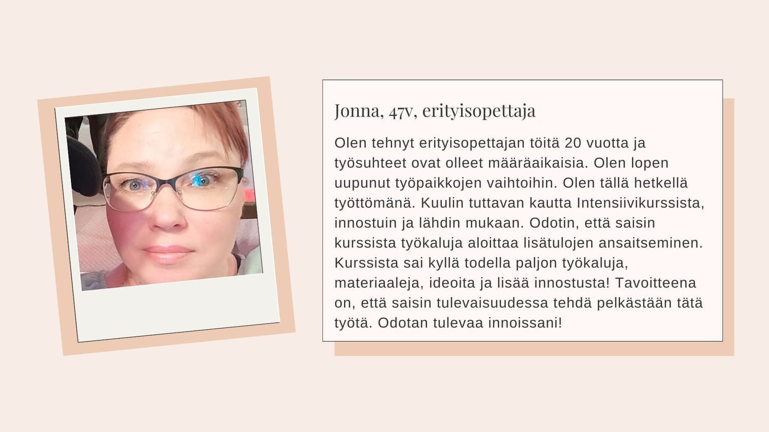 Intensiivikurssilta sain paljon työkaluja, joiden avulla sain oman bisneksen pyörimään jo kurssin aikana. Sain varmuutta siitä, että en ole tekemässä yksin tätä vaan meillä on iso ja kannustava yhteisö tekemässä yhdessä tätä työtä ❤