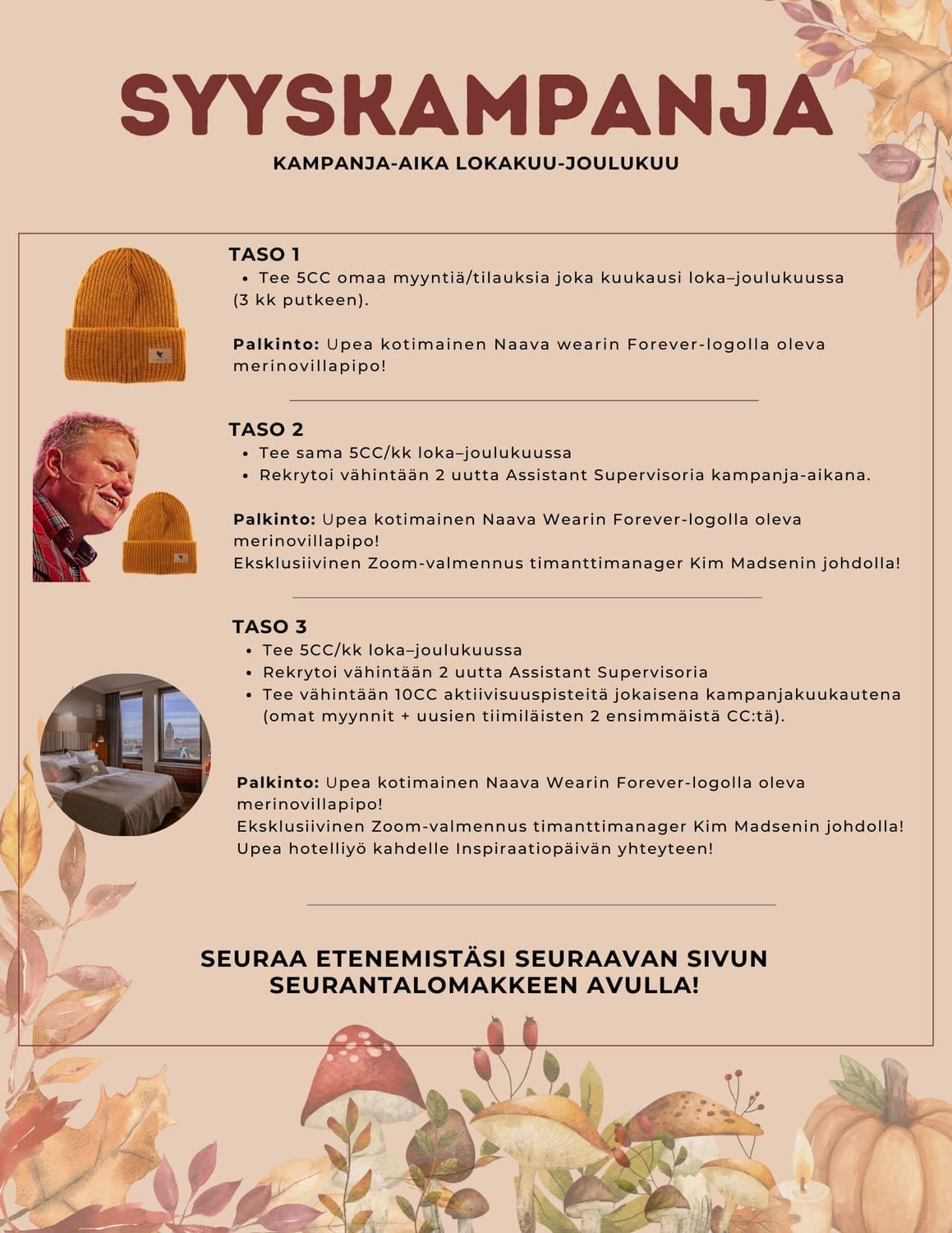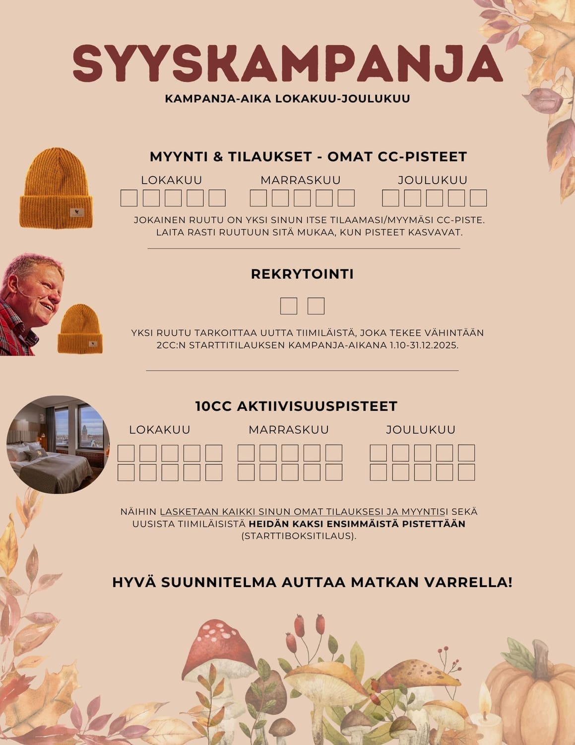 Kampanja-aika on lokakuusta joulukuuhun, ja se palkitsee sinut määrätietoisesta tekemisestä — omista CC-pisteistä, uusien tiimiläisten rekrytoinnista ja aktiivisuudesta.