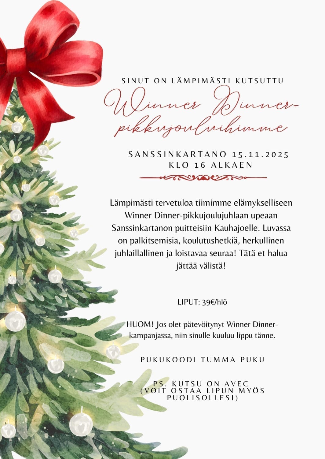 Meillä on oman tiimin superihanat WINNER DINNER-pikkujoulut 15.11 Kauhajoen upeassa Sanssinkartanossa. Ne on tarkoitettu kaikille vasta-aloittaneista kokeneisiin konkareihin.