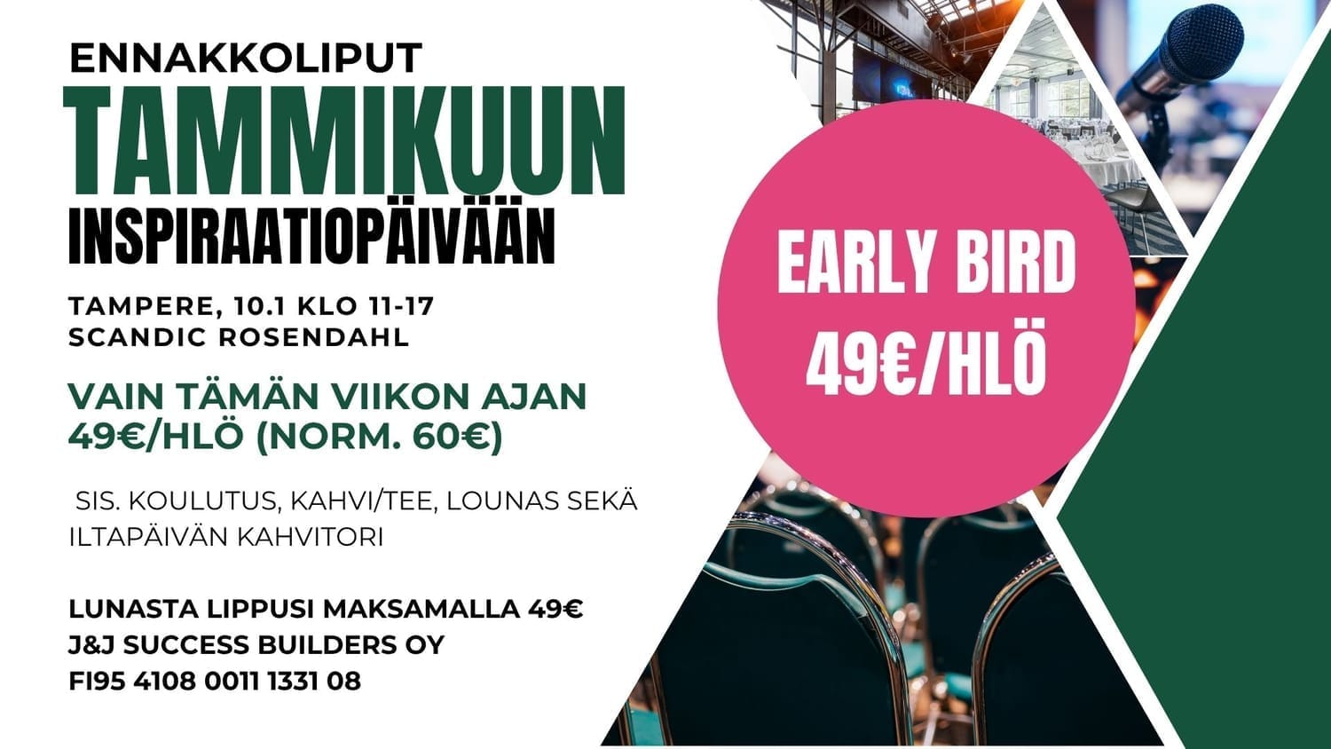 Tämän VIIKON ajan eli 2.11 asti sinulla on mahdollisuus lunastaa ennakkoliput tammikuun HUIKEAAN inspiraatiopäivään Tampereella! Paikkana on kaunis Scandic Rosendahl ja itse kokoustila on upea! Tämä päivä auttaa sinua polkaisemaan vuoden 2026 käyntiin täydellä teholla!