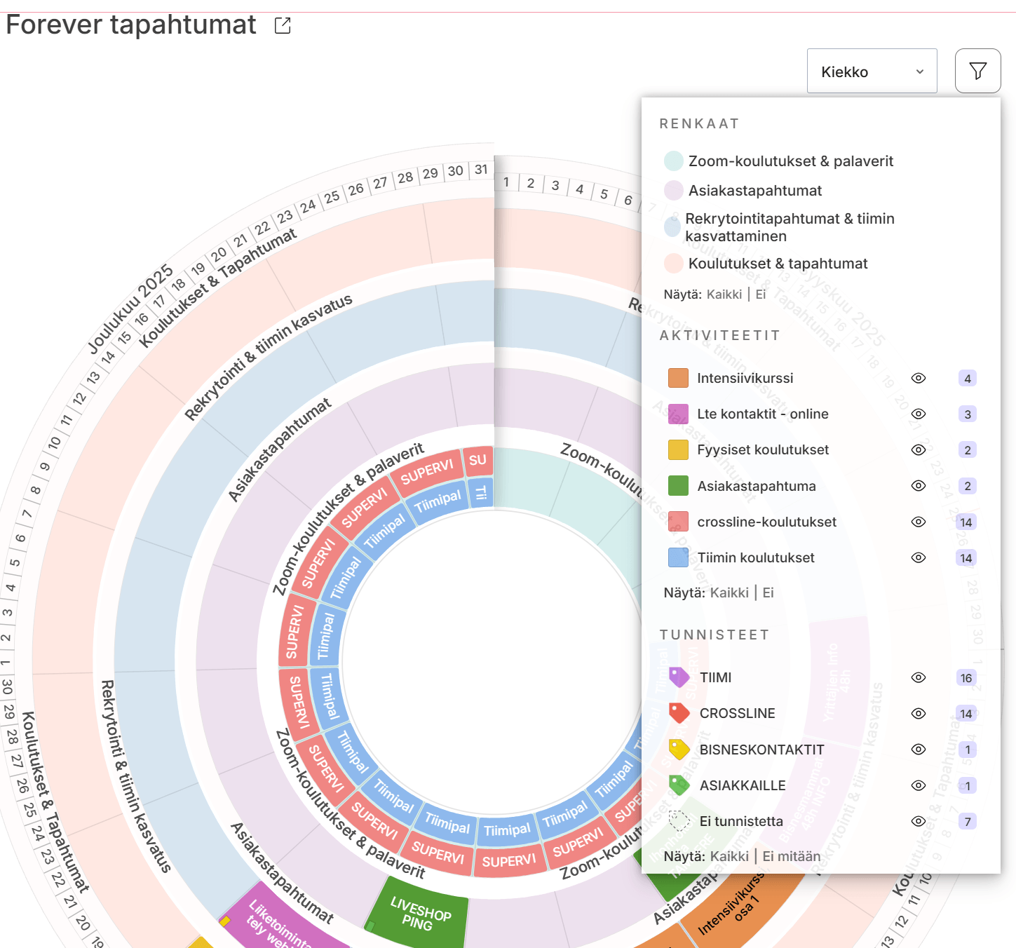 Sinulla on mahdollisuus suodattaa vuosikellon näkymää käyttäen apuna renkaita, aktiviteetteja ja tunnisteita. Klikkaa ylhäällä oikealla olevaa suppilon kuvaa ja pystyt säätelemään silmän kuvasta, että mitkä näkymät sinulle näkyy.