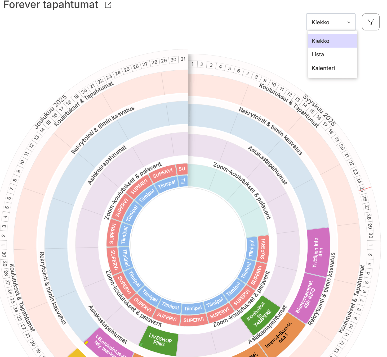 Vuosikellolla on oletuksena pyöreä näkymä, mutta sinulla on mahdollisuus tarkastella vuosikelloa sen sijaan listana tai kalenterina. Voit vapaasti valita pyöreän, kalenterin tai listanäkymän väliltä, ne ovat tiedoiltaan yhtenäiset ja synkronoidut. Pääset valitsemaan näkymän oikealta ylhäältä pudostusvalikosta.