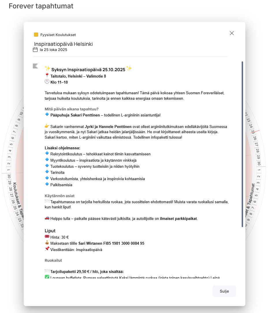 Viikoittain inspiroivia koulutuksia ja palavereja, joissa opit uutta ja pysyt ajan tasalla. Nämä ovat tarkoitettuja tiimimme FBO:lle (Forever Business Ownereille).