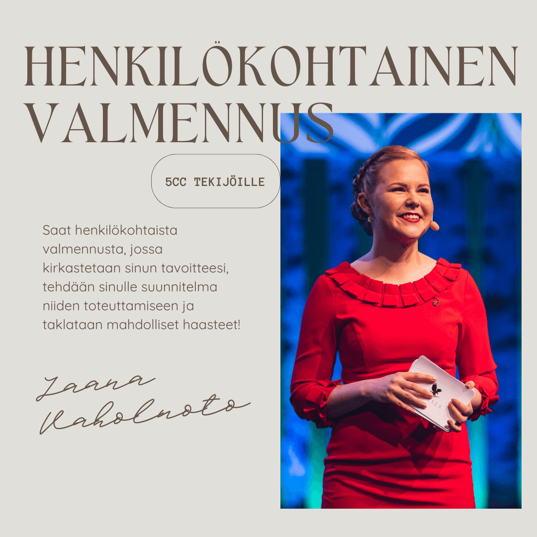 Täältä voit varata kuukauden ohjauspuheluajan itsellesi, jos olet tehnyt edellisessä kuussa 5CC:tä. Muista varata puheluaika aina kuluvan kuun 15. päivään mennessä.